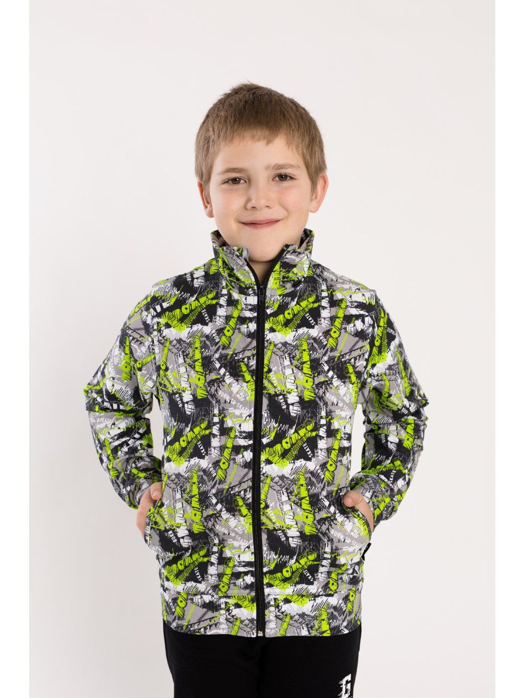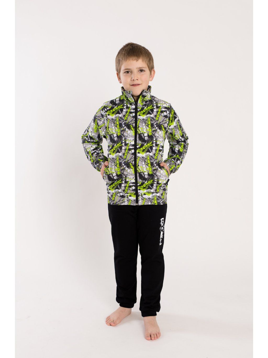 Bavlněná mikina z bavlněné teplákoviny /uvnitř bez teplé smyčky/. Rukávy ukončeny do pružné manžety, krytka zipu proti poškrábání, pohodlný střih ukončený do pasu, zapínání na zip a dvě postranní kapsy. Nabízíme do kompletu tepláky a tričko.