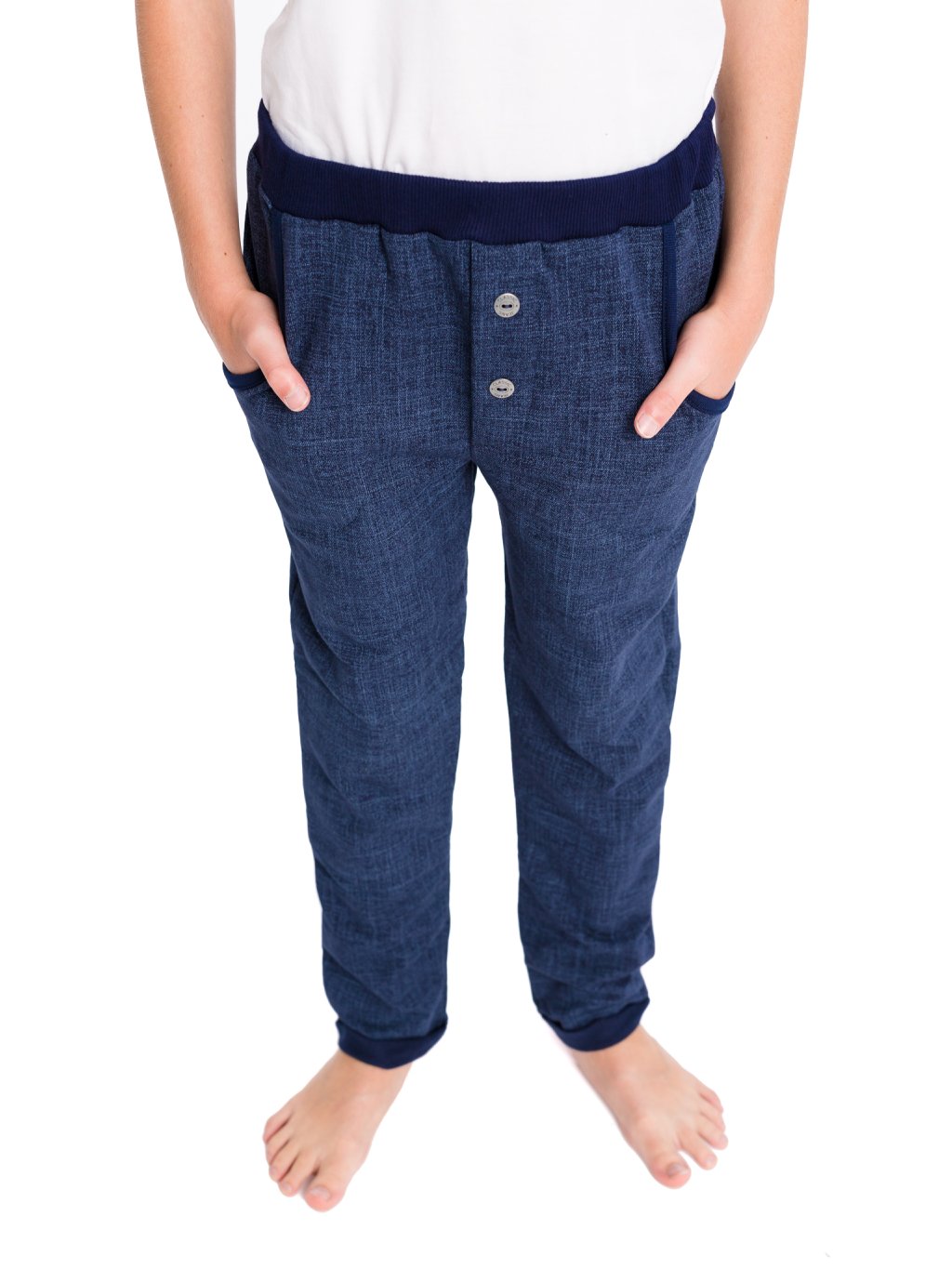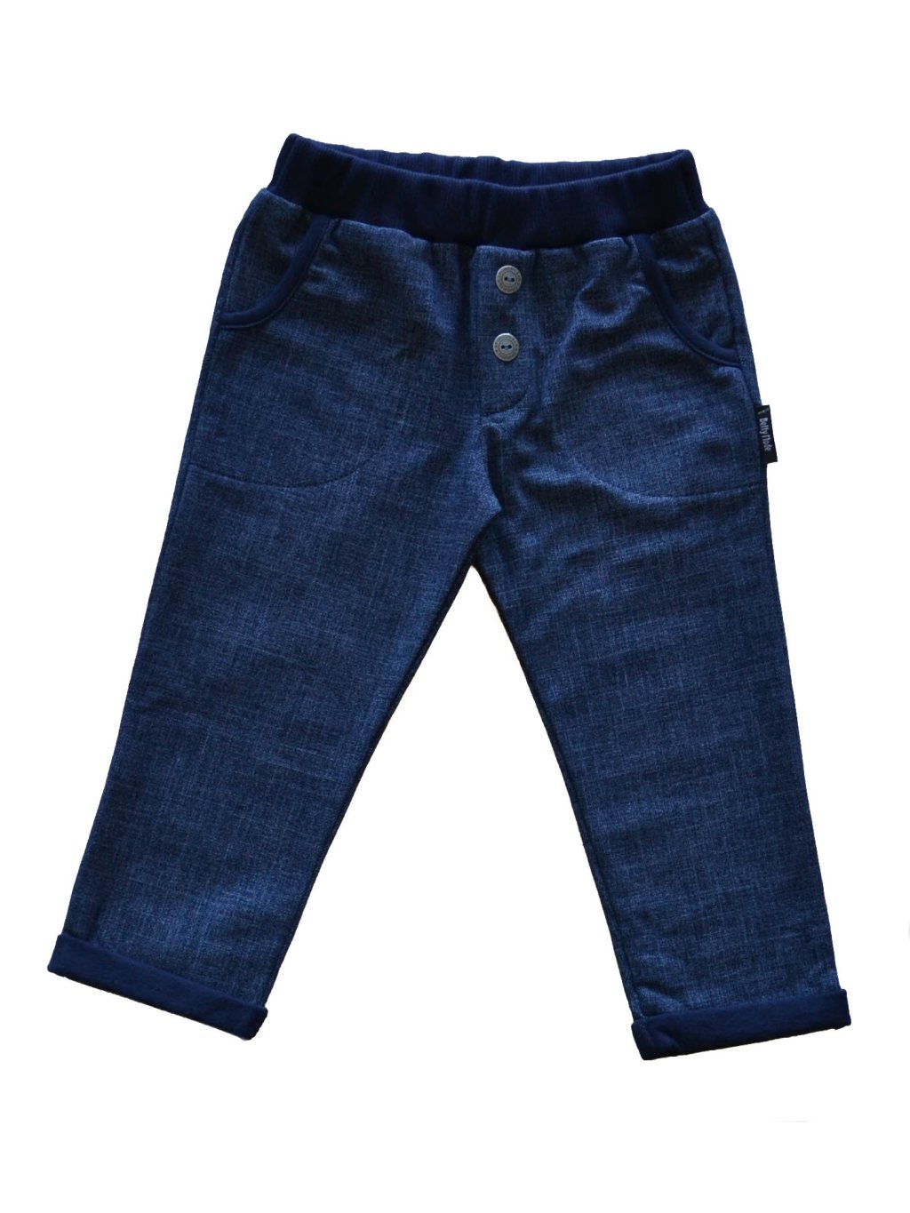 Chlapecké bavlněné kalhoty s hřejivou vnitřní stranou vhodné do chladnějšího počasí. Počesaný bavlněný materiál v imitaci černého a modrého denimu. Kalhoty jsou ozdobeny knoflíky, ale pozor poklopec je falešný. V pase pružný bavlněný úplet, který se lehce přizpůsobí. Dole jsou kalhoty ukončeny rovně obrubou. Imitace denimu dodává stylový vzhled. Guma v pase je na volno, prošitá pouze po stranách.