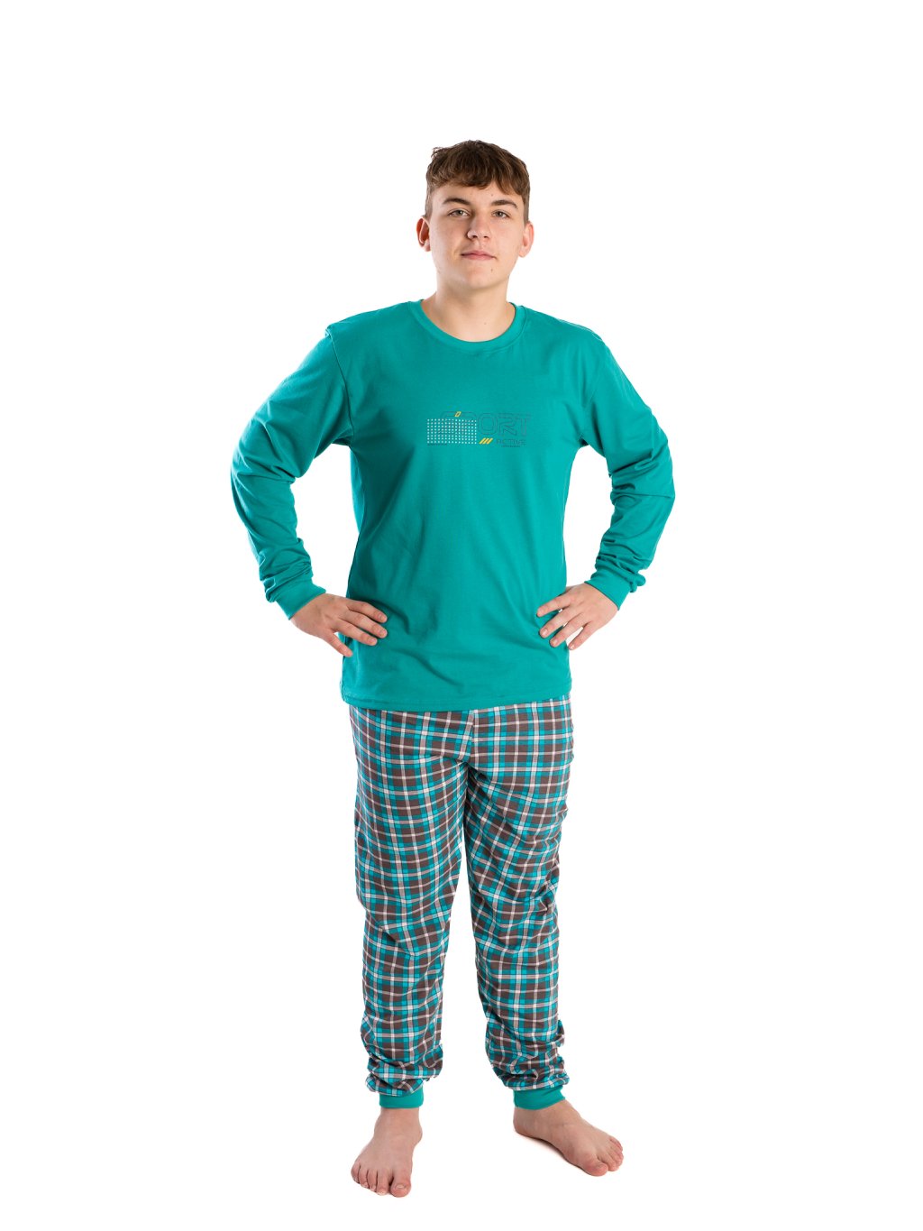 Chlapecké pyžamo je ušito z kvalitní 100% bavlny. Pyžamo má volný střih, proto se v něm budete cítit pohodlně. V pase je pružná guma šíře 2 cm, která není prošitá, lze ji vyměnit. Horní díl v barvě petrolejové a kárované kalhoty. Rukávy i nohavice ukončeny pružnou manžetou.