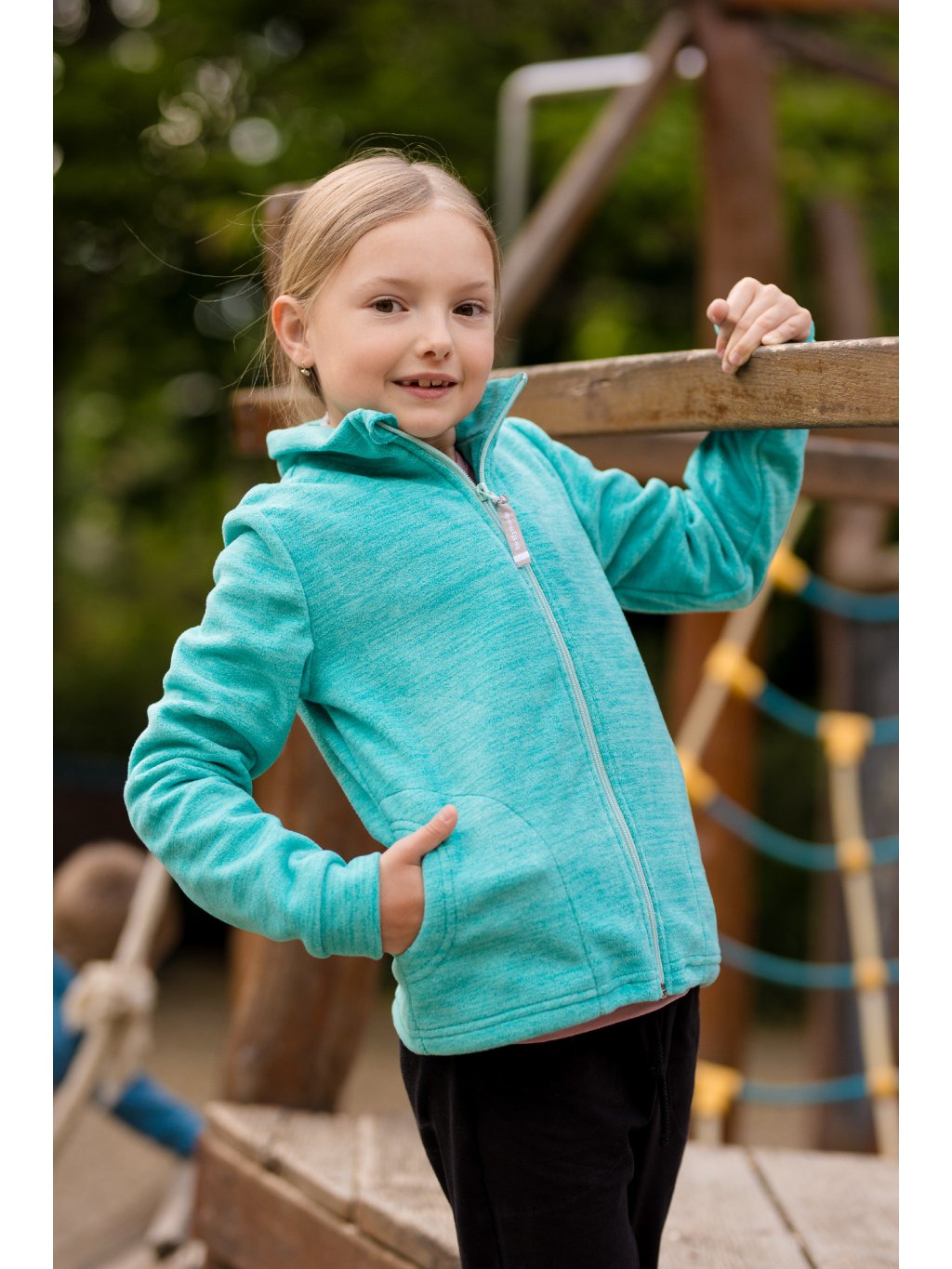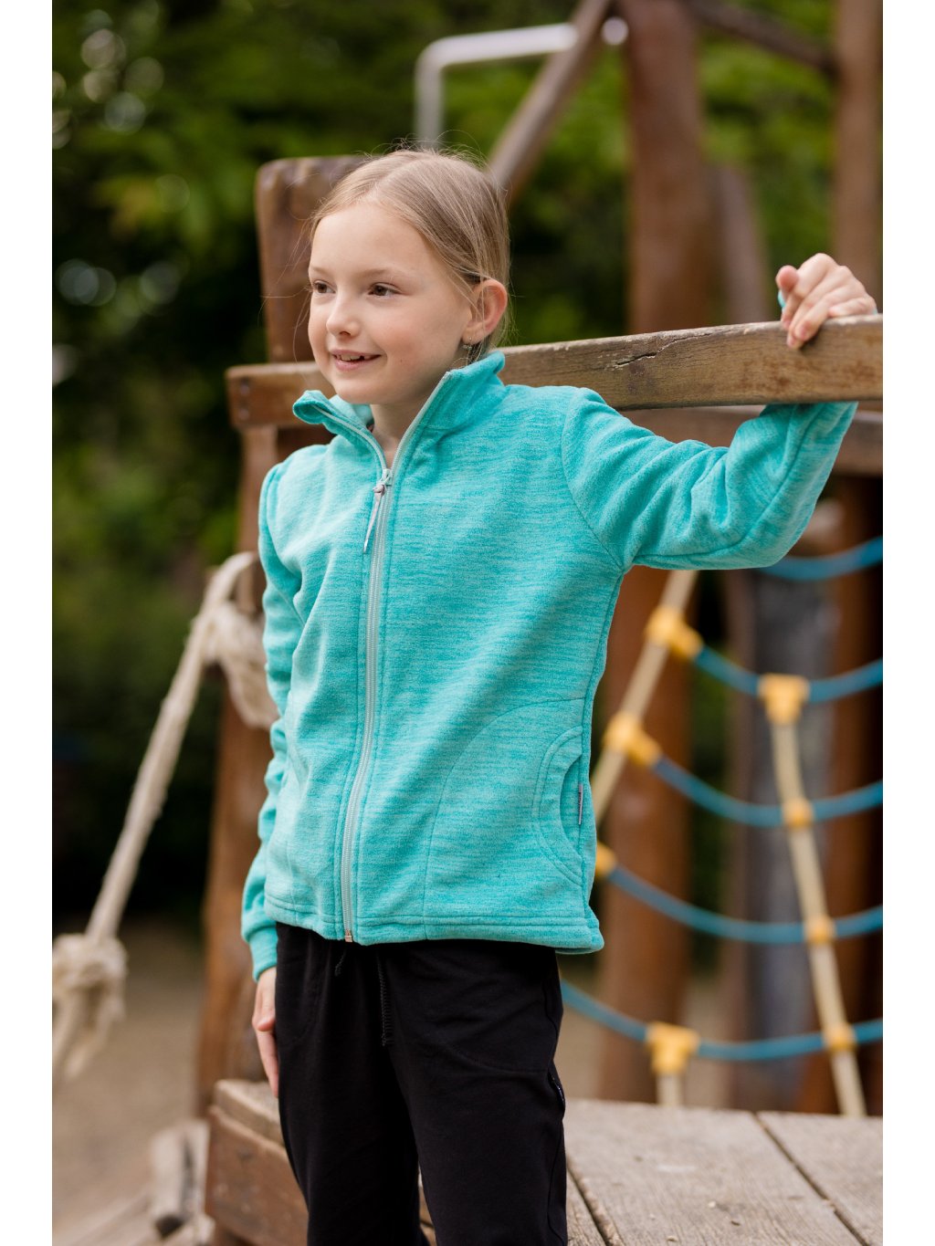 Dívčí mikina z fleecu na zip. Ideální jako druhá vrstva oblečení. Z rubové strany má krátce střižený počesaný chloupek, materiál je lehce pružný. Vhodná na podzimní a zimní počasí. Mikina má stojáček, chránič u brady a spodní lem s možností regulace pasu.