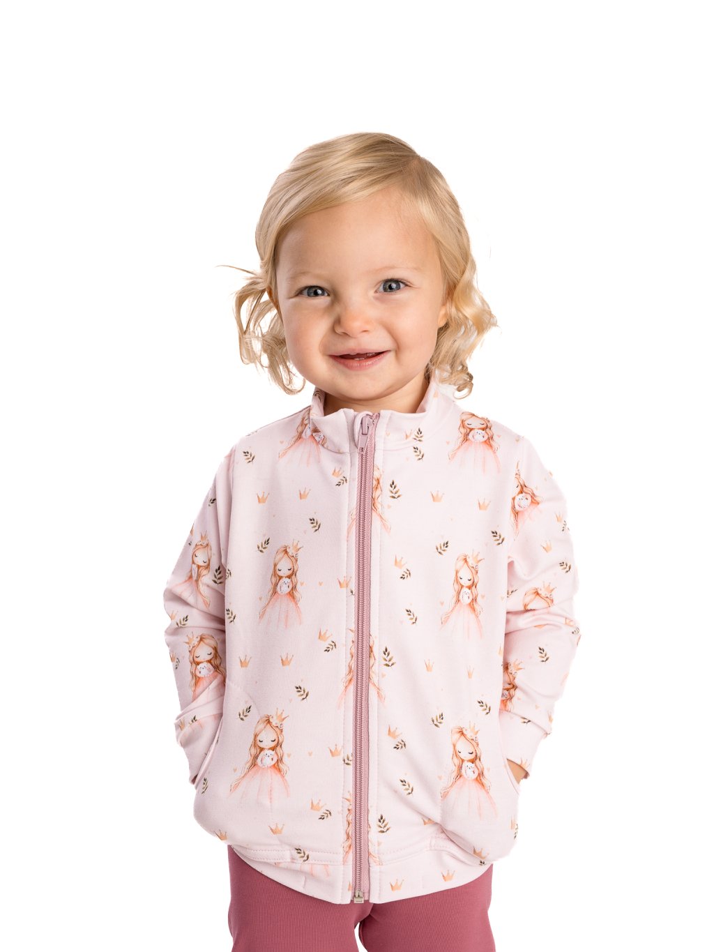 Dívčí bavlněná mikina na zip. Rukávy a pas ukončeny pružnou manžetou, krytka zipu u krku.
