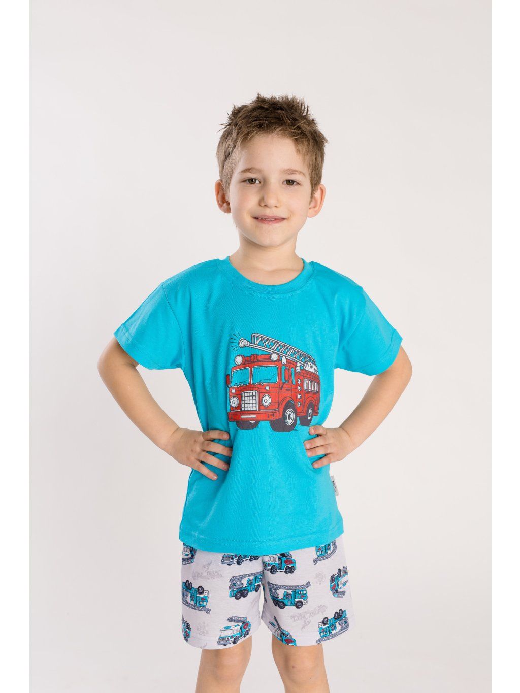 Letní pyžamo s krátkým rukávem, tričko má elastický lem pro snadné oblékání. Kraťasy mají pružnou gumu, která netlačí a lze ji snadno vyměnit. Horní díl světle modré barvy s výrazným obrázkem hasičského autíčka a celotištěnými kraťásky.