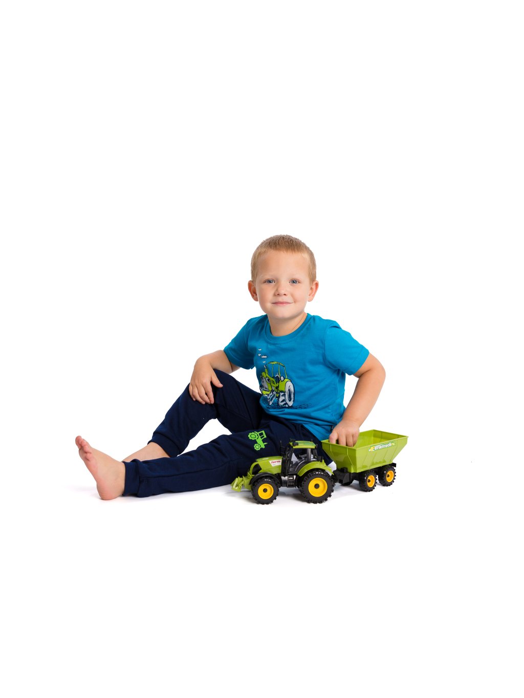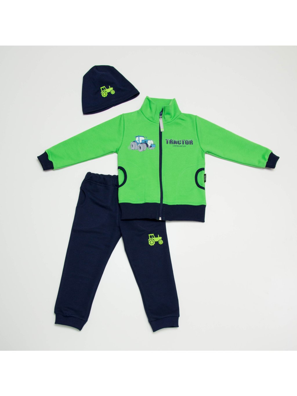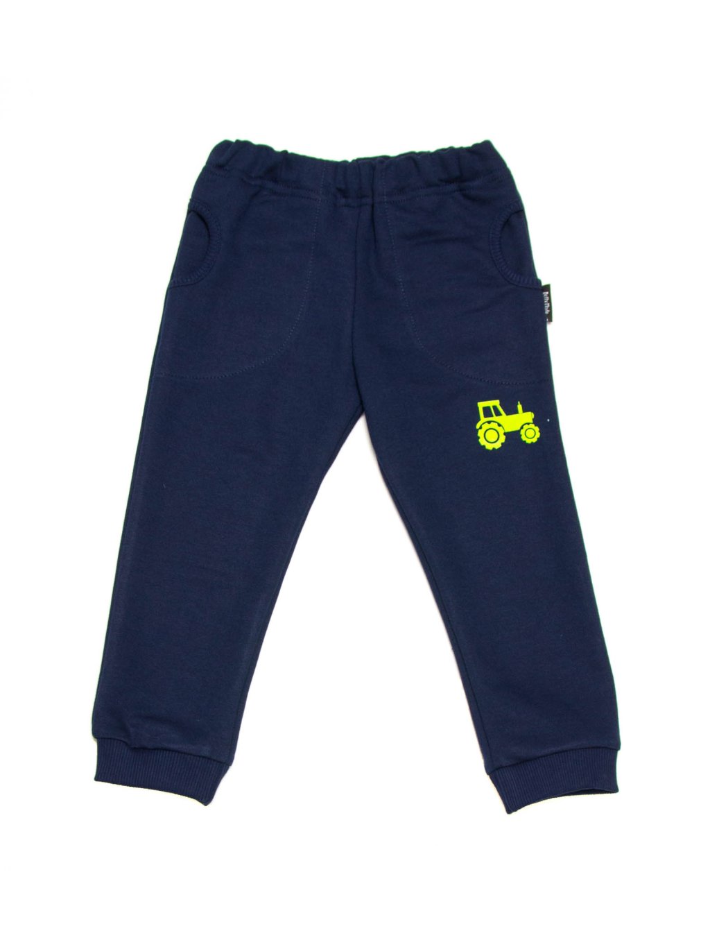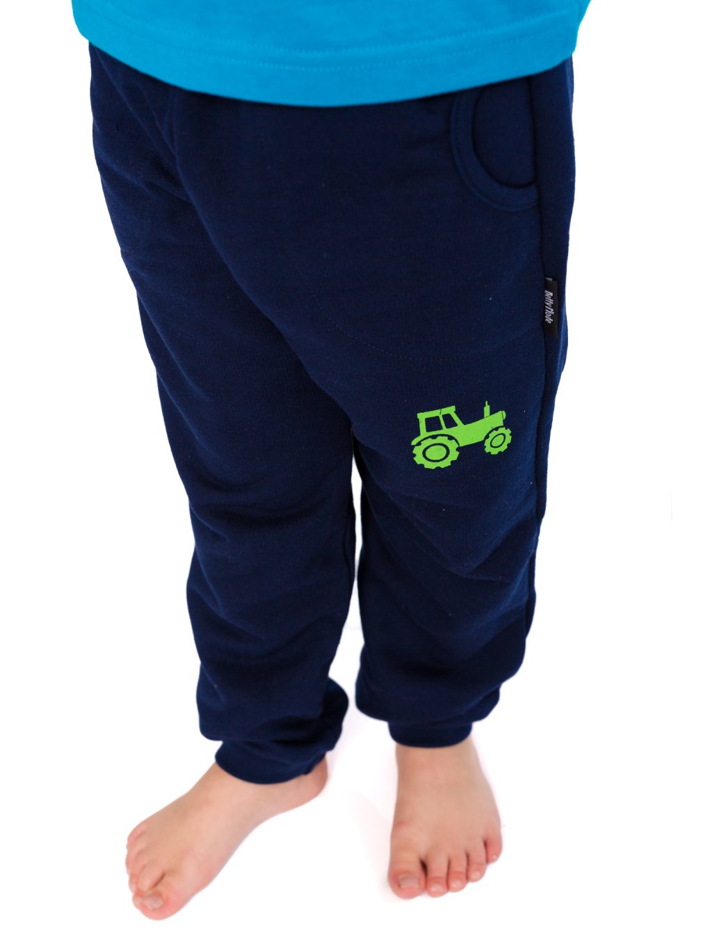 Bavlněné tepláky s obrázkem traktoru. Nohavice ukončeny do úpletu, guma v pase není prošitá, lze dále upravovat. K teplákům můžete do setu zakoupit i mikinu a čepici. Z vnitřní strany pasu je obšitá dírka pro možnost výměny gumy nebo regulaci pasu.