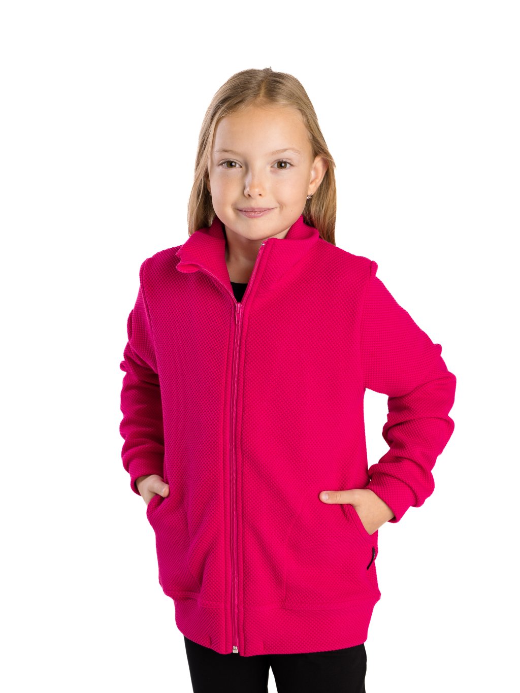 Mikina je vyrobena z příjemného bavlněného materiálu /elastická teplákovina/ a má praktické zapínání na zip. Ochrana zipu proti poškrábání. Rukávy a pas ukončeny manžetou. Uvnitř nemá hřejivou smyčku.