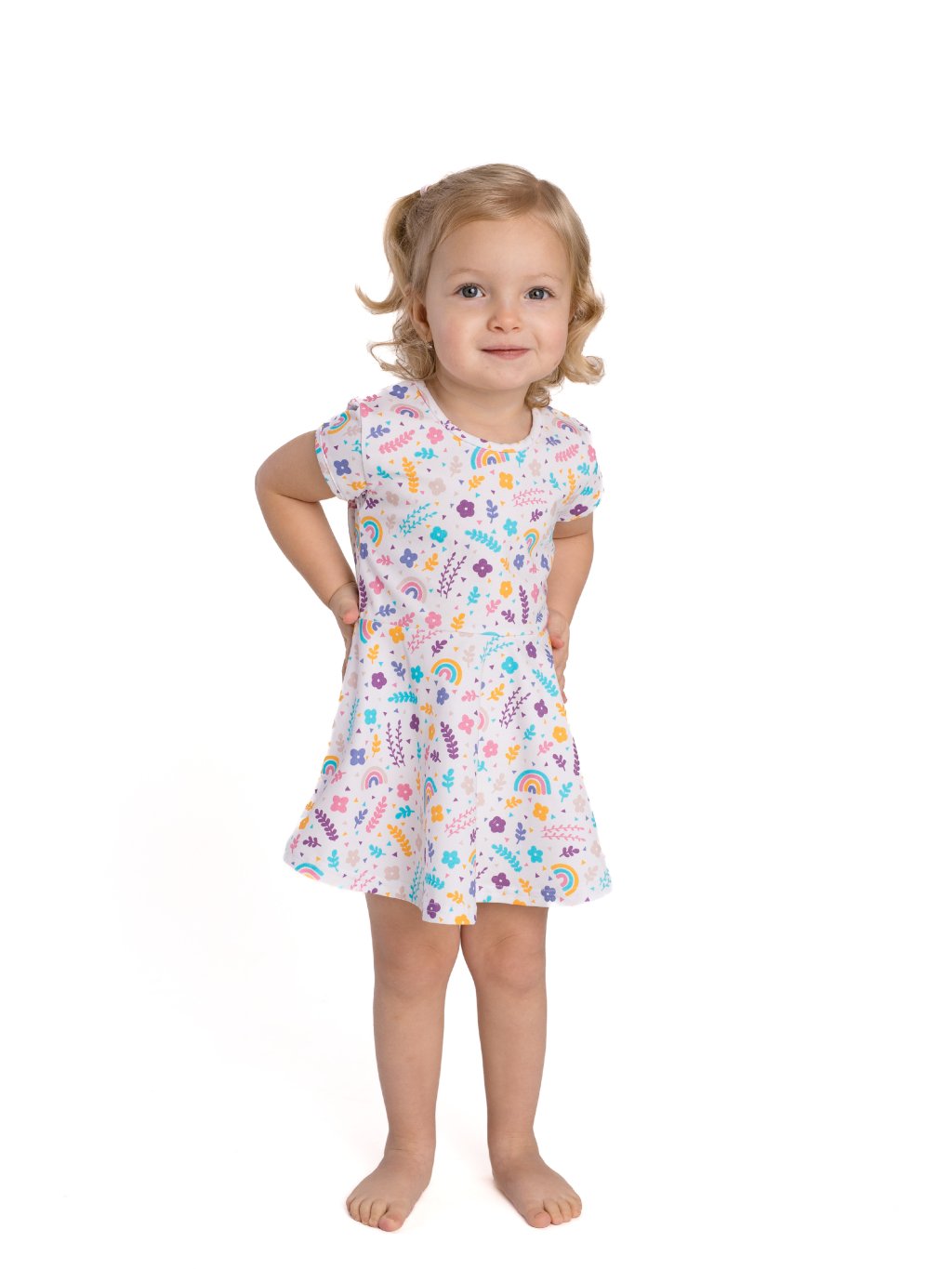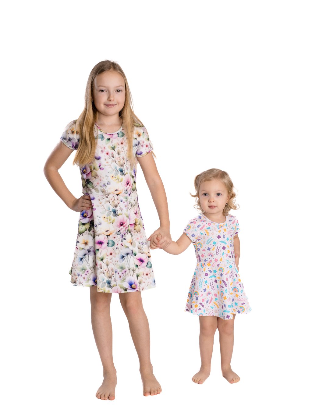 Dívčí šaty s kulatým výstřihem a krátkým rukávem skvěle padnou všem holčičkám. Hodí se pro každou příležitost. Díky elastickému lemu a ověřenému tvaru střihu se dobře oblékají přes hlavu. V jemných pastelových barvách - světle růžová,světle tyrkysová a bílá.
