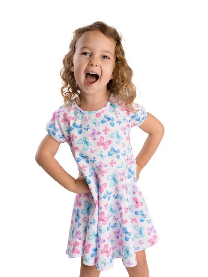 Dívčí šaty s kulatým výstřihem a krátkým rukávem skvěle padnou všem holčičkám. Hodí se pro každou příležitost. Díky elastickému lemu a ověřenému tvaru střihu se dobře oblékají přes hlavu. V jemných pastelových barvách.